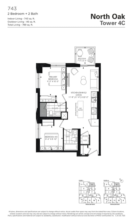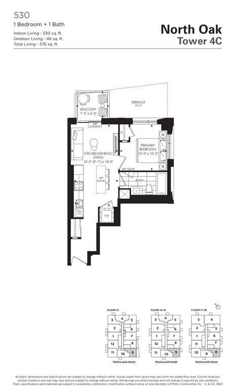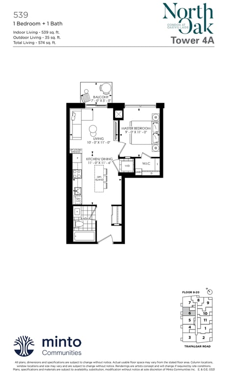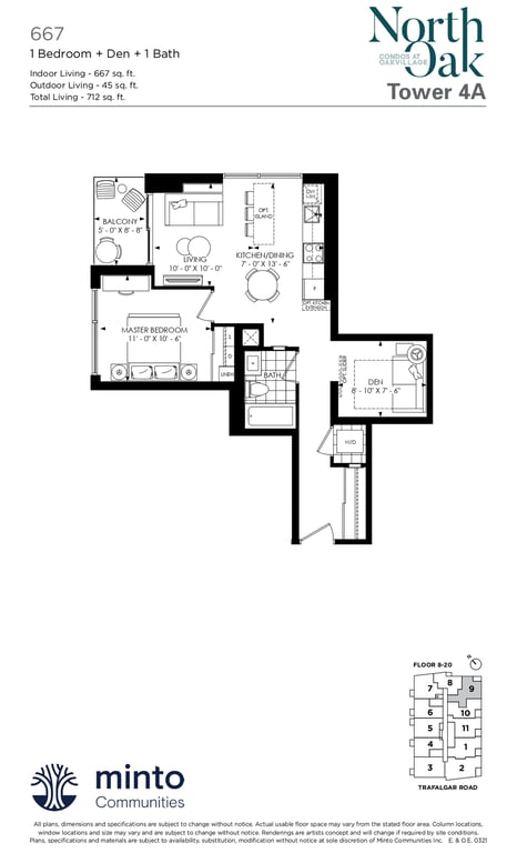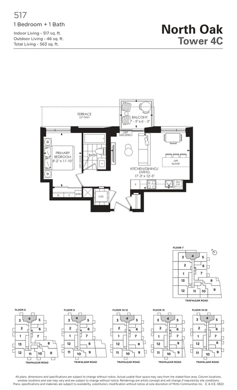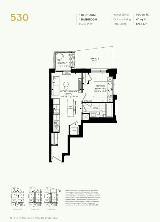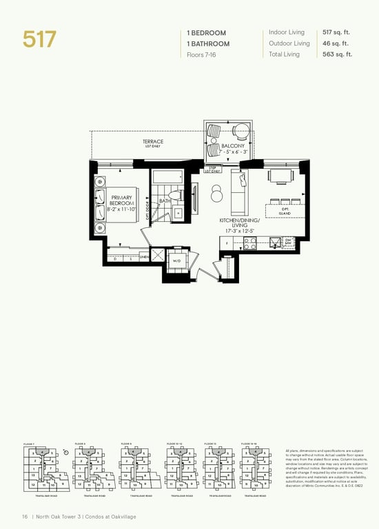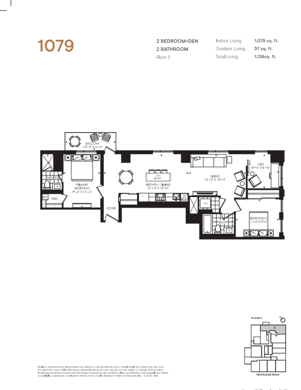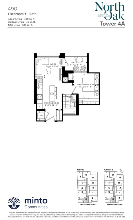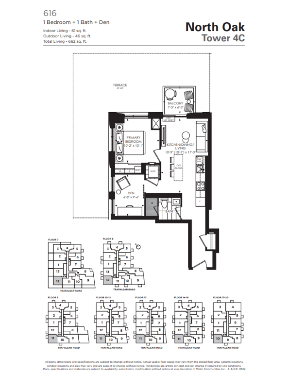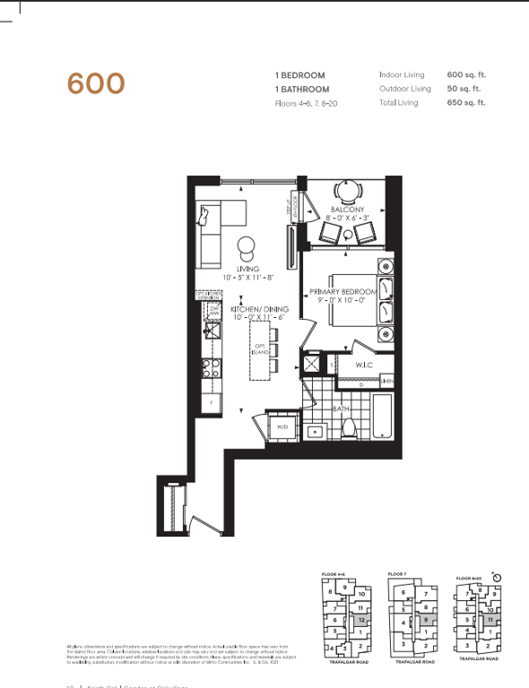 The first condominium building at Oakvillage Community Condos in Oakville will have residential suites with size ranging from 535 to 1066 sq ft. The building two will have 20 storeys and sizes of suites ranging from 600 to 835 sq ft. The number of bedrooms will vary as per the floor plans.