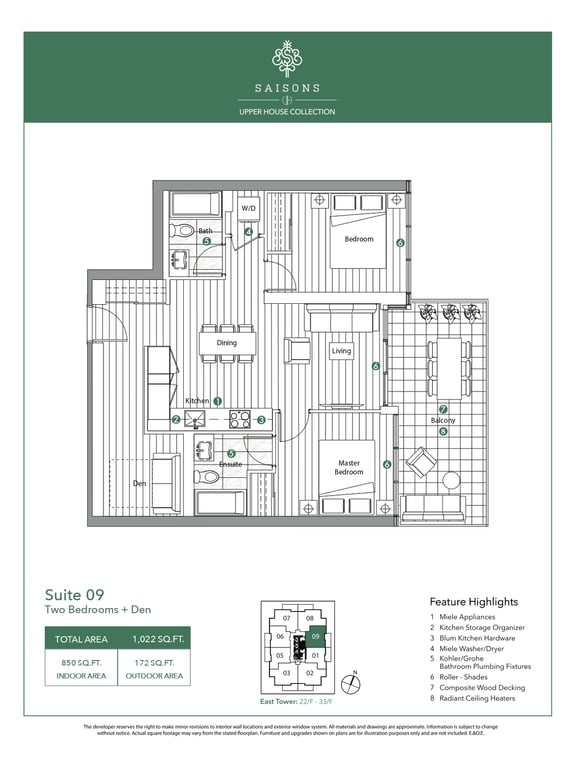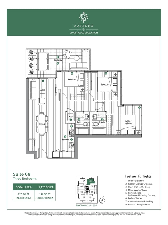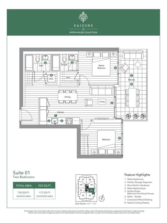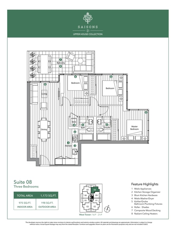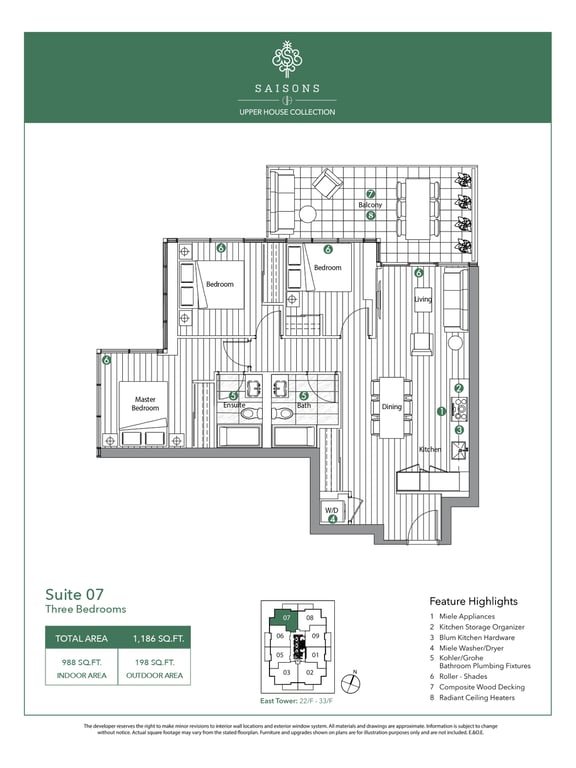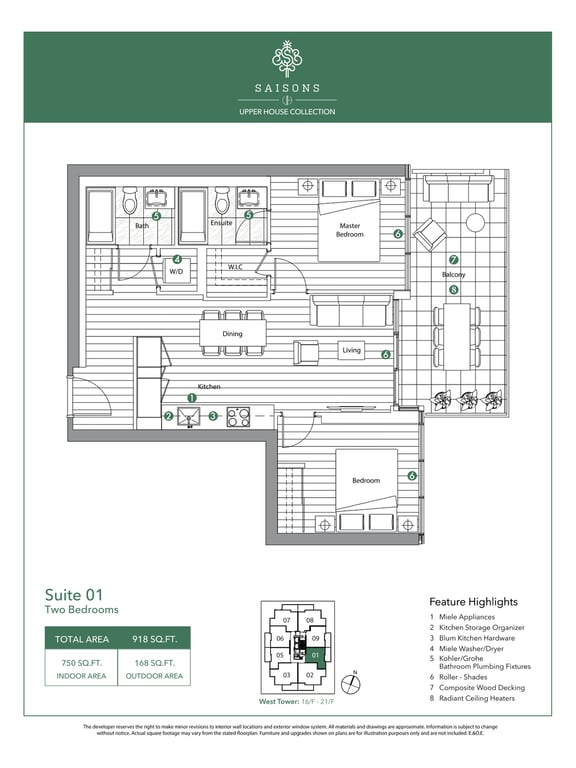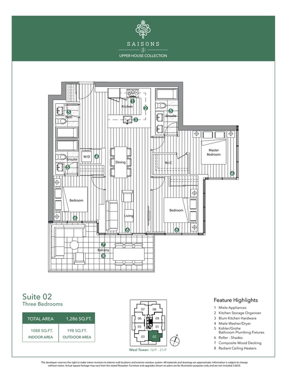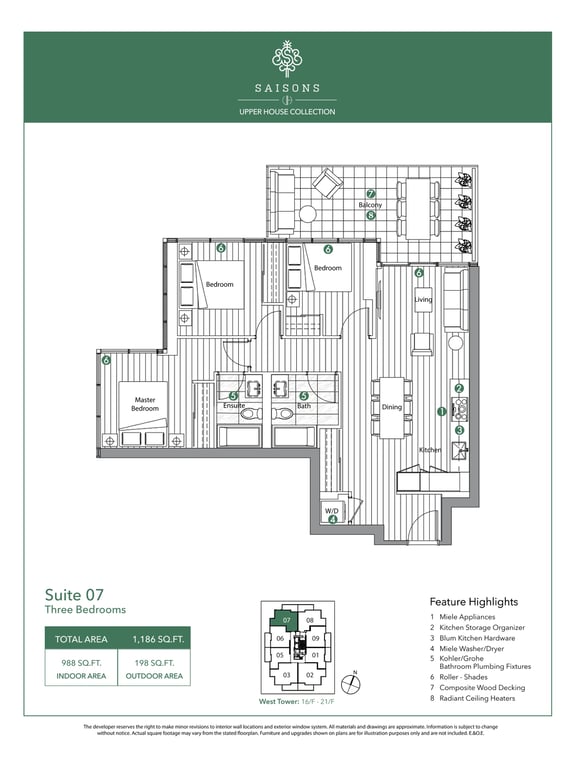 There are a total of eight different floor plans, and the suites range between 1,281 to 1,498 square feet. The condominium units will feature 9 feet tall ceilings. Open balconies and terraces add to the aesthetics of the units. The appliances in the units will also be of premium quality.